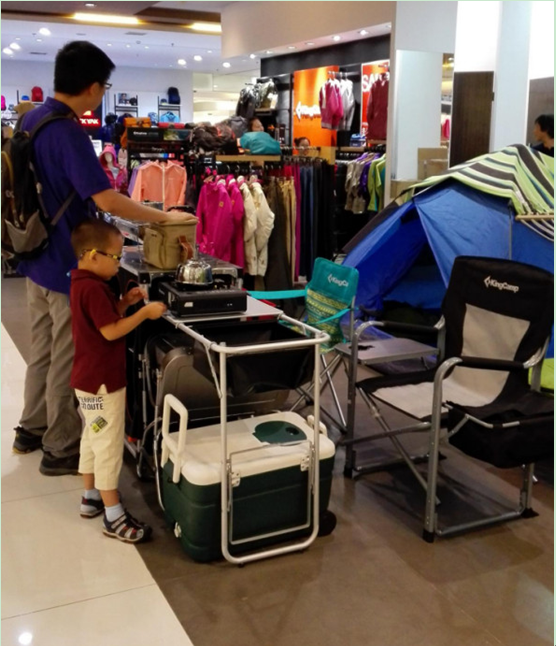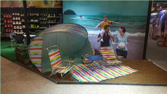 户外生活馆内装备区有野餐烧烤、自驾露营、沙滩休闲、日常休闲等场景化的模拟。每一个场景都配有相应的装备,小到水瓶,大到帐篷,消费者可近距离的体验每个场景中的每件装备,并根据户外活动的类型选择适合自己的装备。